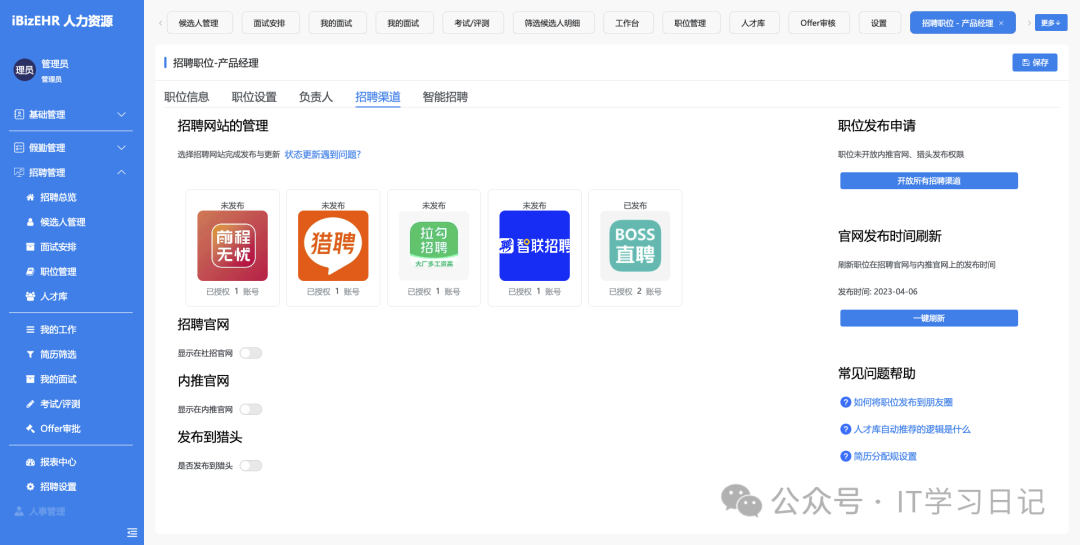 • 职位管理:职位模板、岗位描述、发布渠道管理。