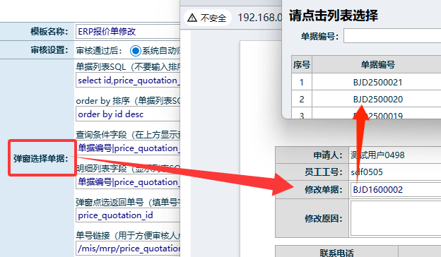 弹窗选择单据:用于申请时点击输入框弹出窗口,选择单据后将单号填入输入框。