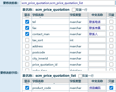 1、找出修改位置对应的表和字段,scm_price_quotation表的tel、fax、contact_man,scm_price_quotation_list表的reference_sale_price,将表名填入“要修改的表”,点确定;