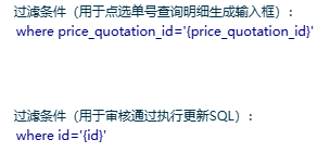 3、scm_price_quotation表,主表,查询过滤需要用单号price_quotation_id,单号通过弹窗选择获取,在“弹窗点选返回单号”输入字段名称price_quotation_id,查询过滤用{price_quotation_id}代表单号,主表的更新可用单号,所以更新过滤写法可跟查询过滤一样;