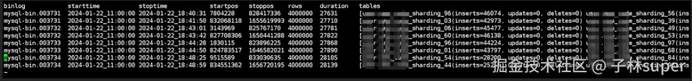 shell> ./my2sql -user repuser -password repuserpassword -host 10.235.98.18 -port 3306 -work-type stats -start-file mysql-bin.003731 -stop-file mysql-bin.003735 -big-trx-row-limit 5000 -output-dir /tmp/log/my2sql_output