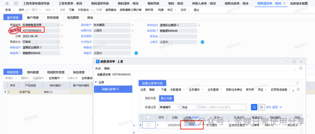 【概述】销售退货单的成本来源主要有以下方面:1.销售退货单是否由原销售出库单直接下推,由销售出库单直接下推的销售退货单直接取销售出库单的源单成本;如下图的销售退货单(XSTHD000433)是由销售出库单(XSCKD0476)直接下推生成的,销售退货单的成本来源是上游单据携带;2.销售退货单如果是由销售出库单下推退货通...