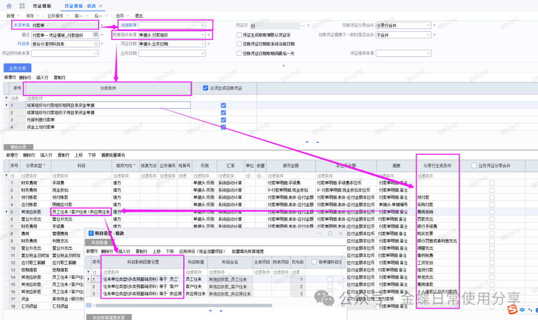 【概述】业务模块的单据,根据凭证模板生成到总账凭证。凭证模板用于设置凭证各要素的取值规则,如凭证日期、凭证字、摘要、科目、借贷方向及金额等。根据凭证模板配置,建立业务和财务的数据关联,实现业务财务一体化,保证账务处理的质量和效率。【详细说明】凭证模板的总体编制逻辑:单据来源——适用账簿——核算组织来源——分类条件——分...