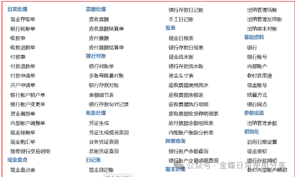 主要包括基础设置、日常业务处理、日记账登记、盘点与对账以及报表输出等环节。具体如下:-基础设置:维护银行账号、现金账号等账户信息,设置结算方式、收付款用途,配置系统参数与启用日期,并录入现金、银行存款的期初余额。-日常业务处理:处理现金存取、银行转账等资金流转业务,通过应收单、应付单等下推生成收款单、付款单及相应退款单...