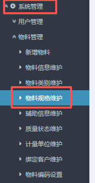 1.进入ERP系统之后,在左侧的功能菜单里找到“系统管理”,点开“物料管理”,点击“物料规格维护”。
