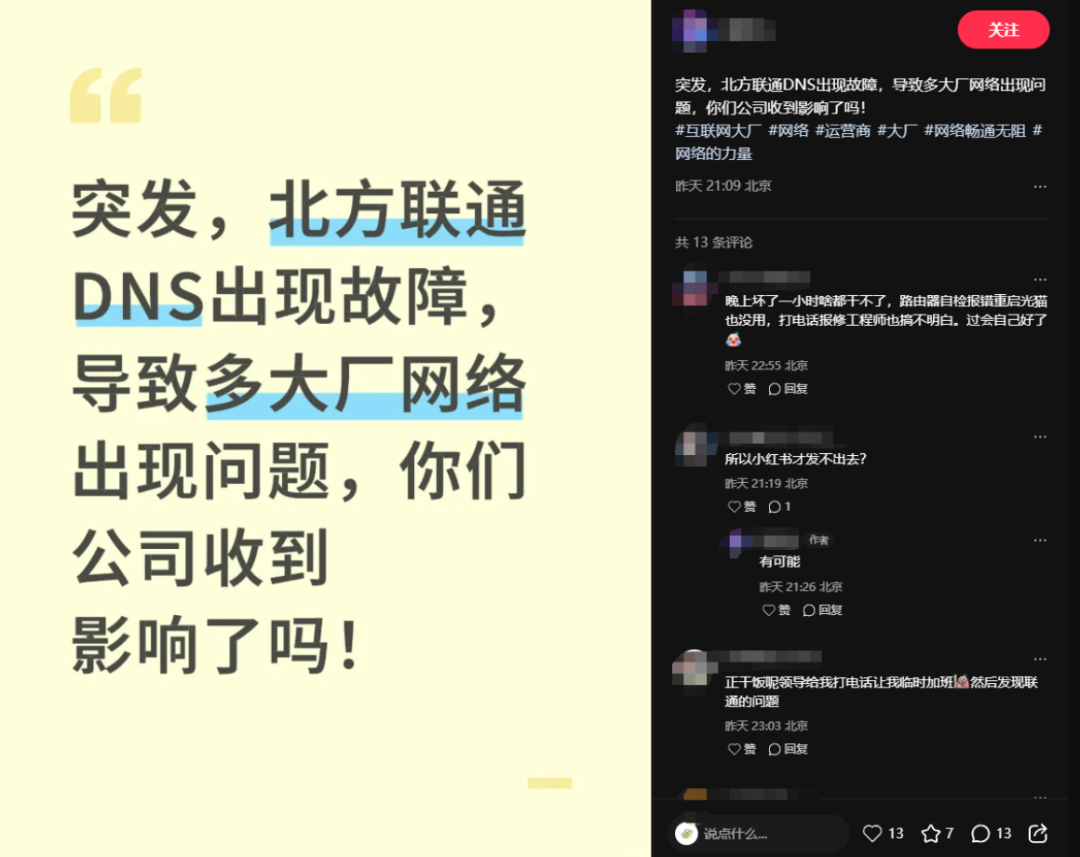 联通DNS污染事件,一场由域名解析故障引发的网络危机。01联通网络大面积瘫痪2025年8月12日晚,北京一位电动车用户在雨中充电,扫码付款时屏幕突然显示网络连接失败。与此同时,公司白领发现抖音、微博无法刷新,餐厅顾客无法用支付宝结账——无数人反复开关手机,却未意识到一场区域性网络瘫痪正在蔓延,这已是24小时内北京地区第...