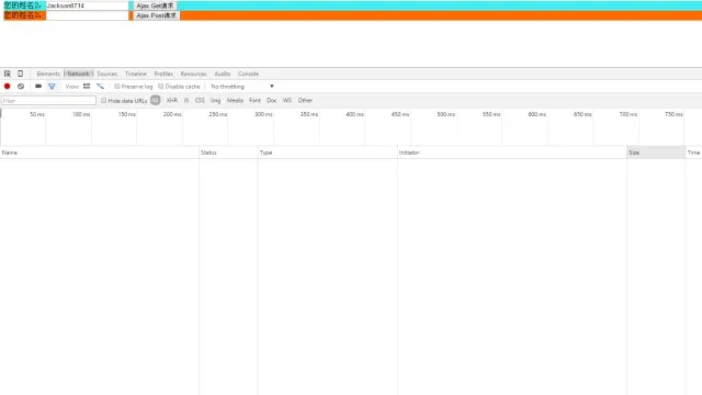 <!DOCTYPE html> <html lang="en" xmlns="http://www.w3.org/1999/xhtml"><head> <meta charset="utf-8" /> <title></title> <script type="text/javascript" src="Ajax.js"></script> </head><body> <div id="Test" style="background-color:#40eeee"> 您的姓名2:<input type="text" id="testGetName" size="20" /> <button type="button" onclick="testGet();">Ajax Get请求</button> </div> <div id="Test" style="background-color:#ff6a00"> 您的姓名3:<input type="text" id="testPostName" size="20" /> <button type="button" onclick="testPost();">Ajax Post请求</button> </div> <div id="myDiv" /> </body></html>