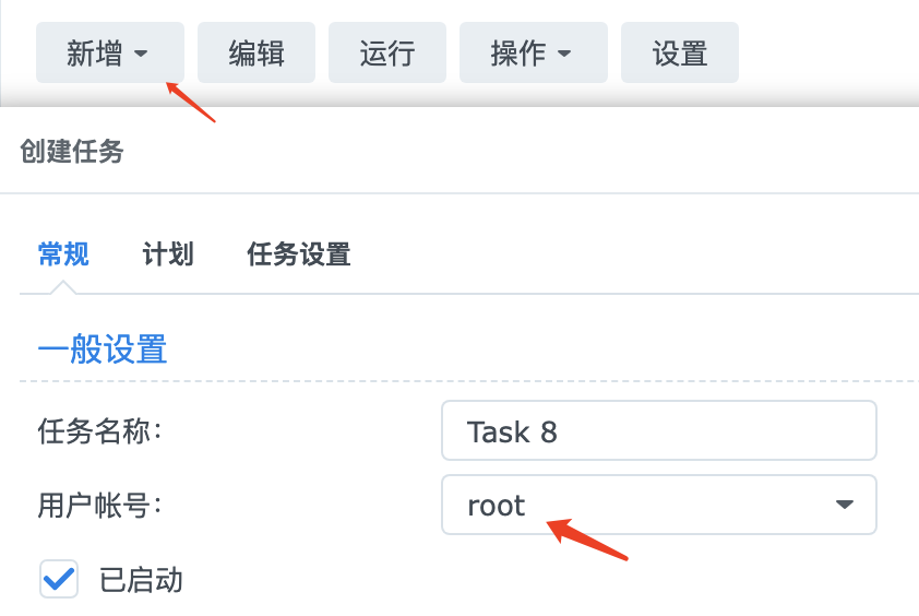 点击新增按钮来创建一个新的任务。如果要运行docker命令,则需要选择用户账号为root,否则没有执行权限