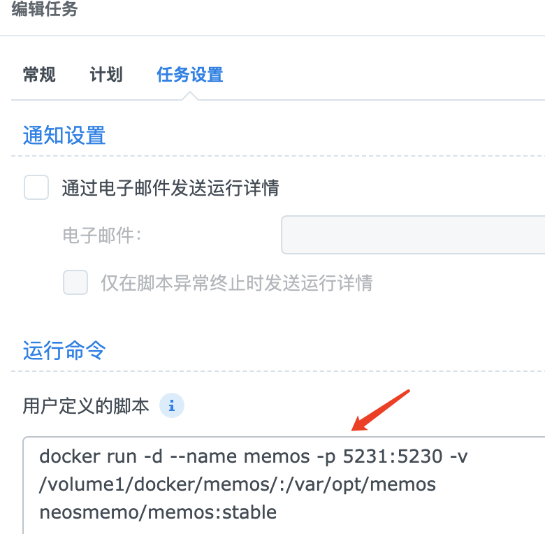 最后就是在任务设置中填入脚本,这里的脚本就是docker命令了,这和前面的docker-compose文件类似,都是拉取镜像启动容器。需要注意的是这里docker命令必须要把映射路径设置为memos文件夹的全路径/volume1/docker/memos