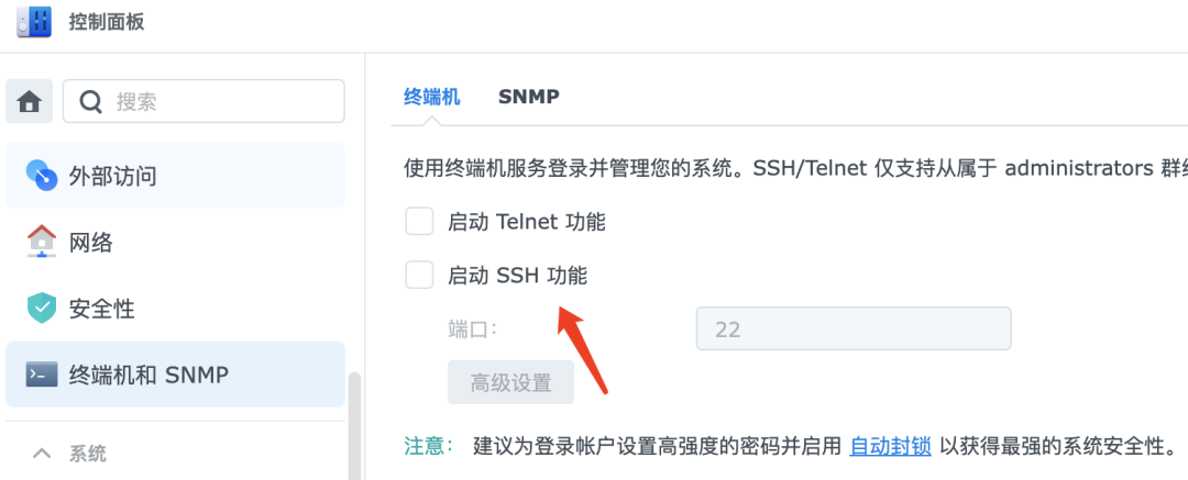 群晖的控制面板可以打开SSH功能,这样可以通过终端直接连接到群晖进行命令行操作