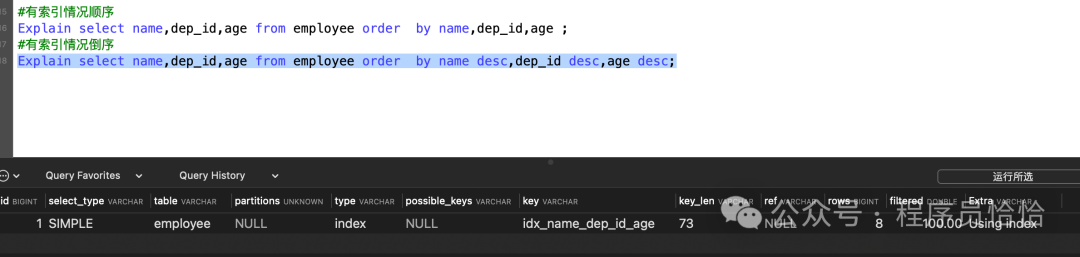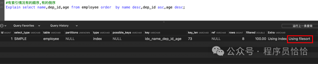 注意的是虽然我已经创建了覆盖这些列的联合索引 idx_name_dep_id_age2,但 MySQL 优化器仍然可能会决定使用文件排序(filesort)来执行这个顺序的排序操作。