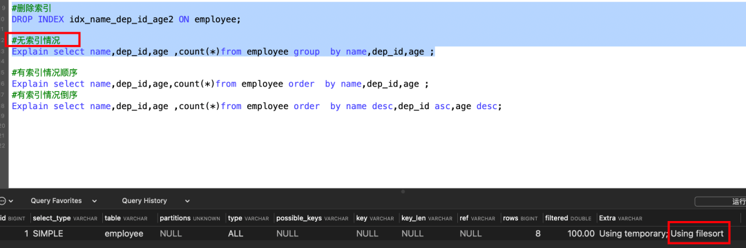 无索引情况下,分组,出现filesort,type为All出现了全表扫描。