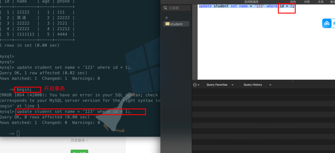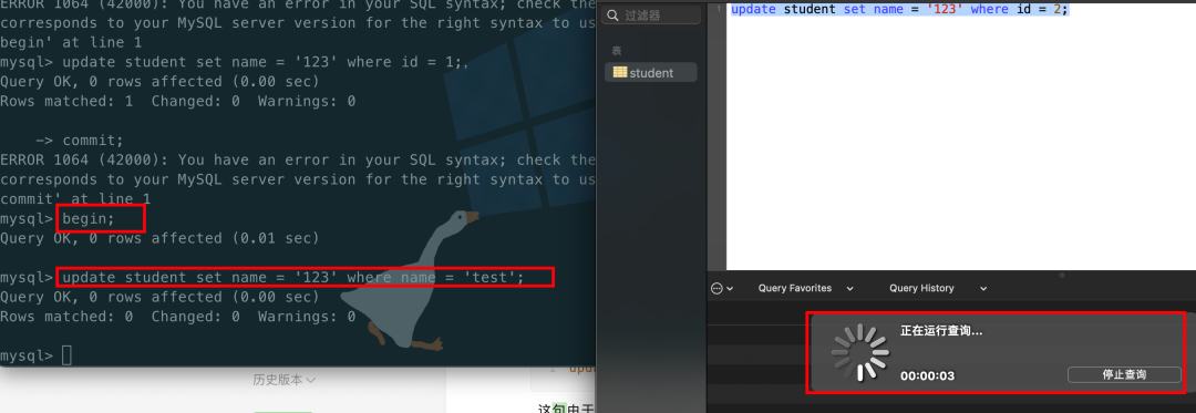 开启两个会话:更新student表的数据,会话1更新name(name字段无索引)为2的数据,会话2更新id为2的数据update student set name = '123' where name = 'test';