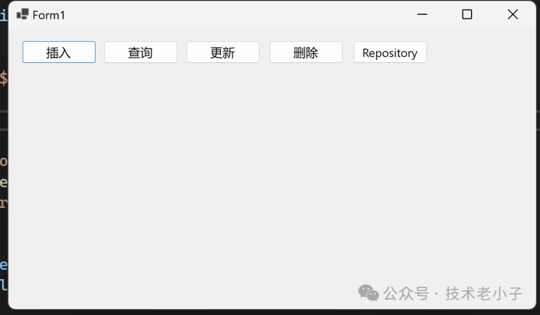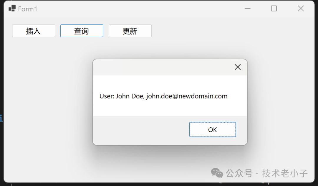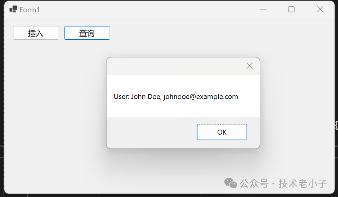 // 查询数据        var user = userRepository.GetById(newUser.Id);        if (user != null)        {            MessageBox.Show($"User found: {user.Name}, {user.Email}");        }