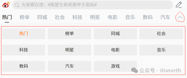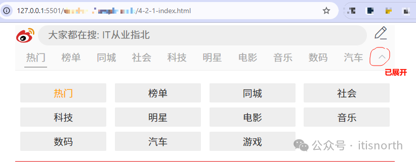 <div class="nav">   <a href="#" class="selected">热门</a>   <a href="#">榜单</a>   <a href="#">同城</a>   <a href="#">社会</a>   <a href="#">科技</a>   <a href="#">明星</a>   <a href="#">电影</a>   <a href="#">音乐</a>   <a href="#">数码</a>   <a href="#">汽车</a>   <img     id="menuControl"     class="expand"     src="../img/4-2-1-expand.png"     onclick="toggleMenu()"     width="30"     height="30"   /> </div>
