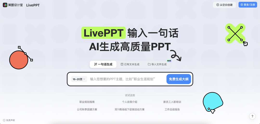 美图公司的 AI PPT 借助人工智能技术,为用户提供了高效、便捷、个性化的 PPT 制作解决方案,适用于商务演讲、会议展示、教育教学、学术报告等多种场景。