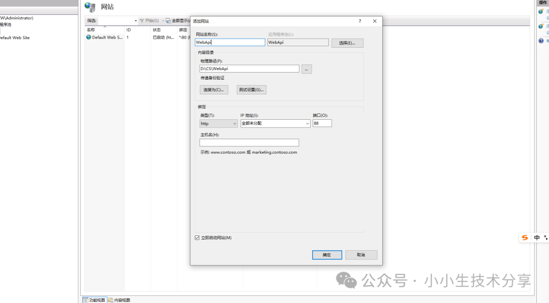 1.右键工程,点击发布2.选择文件夹,然后文件夹位置默认就行,点击完成3.然后点击发布二.部署到IIS1.发布成功后,点击目标位置,打开发布文件位置2.复制里面文件,到发布的文件夹里面3.打开IIS ,添加网站,物理路径选择上一步拷出来文件位置,端口不重复就行,然后点击确认4.点击浏览,打开默认浏览器,就可以显示对完接口了,然后用postman就可以调试了