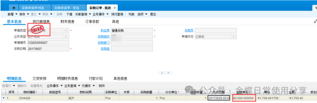 【操作说明】:当需求人员做了资产申请单的情况下,首先调整采购申请单的单据类型为资产采购申请单,再通过选单的方式创建采购申请单,选择采购组织、录入推荐供应商(可选)提交审核。