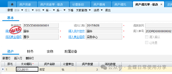 资产调出单审核后,调入货主组织会自动生成一张创建状态的资产调入单
