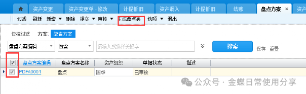 【功能菜单】:资产管理】->【固定资产】->【资产盘点】->【盘点方案】