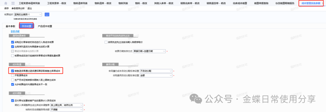 2. 销售退货单如果是由销售出库单下推退货通知单再下推的销售退货单,则需要勾选成本管理系参数“销售退货单通过退货通知单和获取销售出库单成本”从而实现取销售出库单成本;