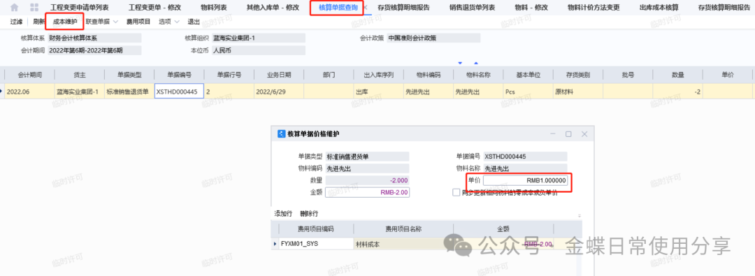 ② 计价方法是先进先出法,如下图所示,销售退货单(XSTHD000445)会把这个销售退货单作为入库序列入库单,无法按计价方法自动计算出对应成本需要手工维护成本,[存货核算]→[核算单据查询]手工维护单据成本;