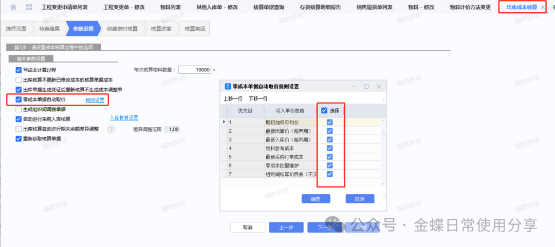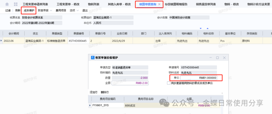 ③ 加权平均和移动平均计价方法若该物料本期无期初和本期入,则无法通过计价方法计算出销售退货单的成本且不想手工维护成本,或者先进先出法不想手工维护成本,可以在出库核算勾选参数[零成本自动取价]并设置零成本取价来源,若零成本取价依旧无法获取到,只能手工进入[存货核算]→[核算单据查询]手工维护单据成本。