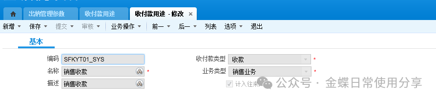 1、出纳管理【业务场景】:出纳管理系统是出纳人员的工作平台,支持企业出纳人员在系统中完成所有相关的货币资金、票据以及有价证券的收付、保管、核算等日常工作,并提供出纳管理报表查询 【用户角色】:出纳 【功能菜单】:【财务会计】->【出纳管理】 2、业务流程【业务场景】:出纳管理系统是出纳人员的工作平台,支持企业出纳人员在系统中完成所有相关的货币资金、票据以及有价证券的收付、保管、核算等日常工作,并提供出纳管理报表查询 【用户角色】:出纳 【功能菜单】:【财务会计】->【出纳管理】 3、基础设置3.1设置公用资料【业务场景】:管理和维护企业的公用资料 【用户角色】:出纳 【功能菜单】:【基础管理】->【基础资料】 【操作说明】:包括供应商、客户、币别、结算方式、物料、费用项目、采购部门、采购组、采购员、组织信息、账簿信息、汇率体系等。该部分数据如果用户由于已经使用供应链、总账等模块已经设置,则在使用出纳管理模块时不需要单独设置。 3.2设置系统参数【业务场景】:根据企业现有情况勾选出纳管理参数 【用户角色】:出纳 【功能菜单】:【财务会计】—>【出纳管理】—>【参数设置】—>【出纳管理参数】 【操作说明】:根据业务需求勾选相对应的参数 3.3设置基础资料【业务场景】:企业根据真实业务情况设置收付款用途 【用户角色】:出纳 【功能菜单】:【财务会计】—>【出纳管理】—>【基础资料】—>【收付款用途】 【操作说明】:收付款用途可根据实际业务请款增加