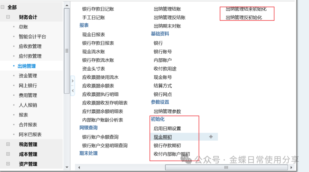 4.1设置系统启用日期【业务场景】:设置出纳管理系统的启用日期。 【用户角色】:出纳 【功能菜单】:【财务会计】—>【出纳管理】—>【初始化】—>【启用日期设置】 【操作说明】:企业根据真实情况选择组织机构启用时间 4.2录入期初单据4.2.1库存现金的期初余额录入【业务场景】:录入库存现金的期初余额 【用户角色】:出纳 【功能菜单】:【财务会计】—>【出纳管理】—>【初始化】—>【现金期初】 【操作说明】:录入库存现金的期初余额 4.2.2银行存款的期初余额录入【业务场景】:录入银行存款的期初余额 【用户角色】:出纳 【功能菜单】:【财务会计】—>【出纳管理】—>【初始化】—>【银行存款期初】 【操作说明】:录入银行存款的期初余额这里需要特别注意,还需要同时录入期初企业未达账和期初银行未达账,保证期初银行存款对账平衡。这些期初未达数据,将参与后续银行存款对账的勾对处理。 4.3结束初始化【业务场景】:出纳管理初始化结束 【用户角色】:出纳 【功能菜单】:【财务会计】—>【出纳管理】—>【初始化】—>【出纳管理结束初始化】,系统结束初始化,正式进入日常业务处理阶段。 【操作说明】:结束初始化工作在第一次结账前进行即可,即录入初始单据和录入第一期单据可以同时进行。