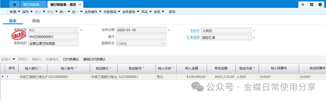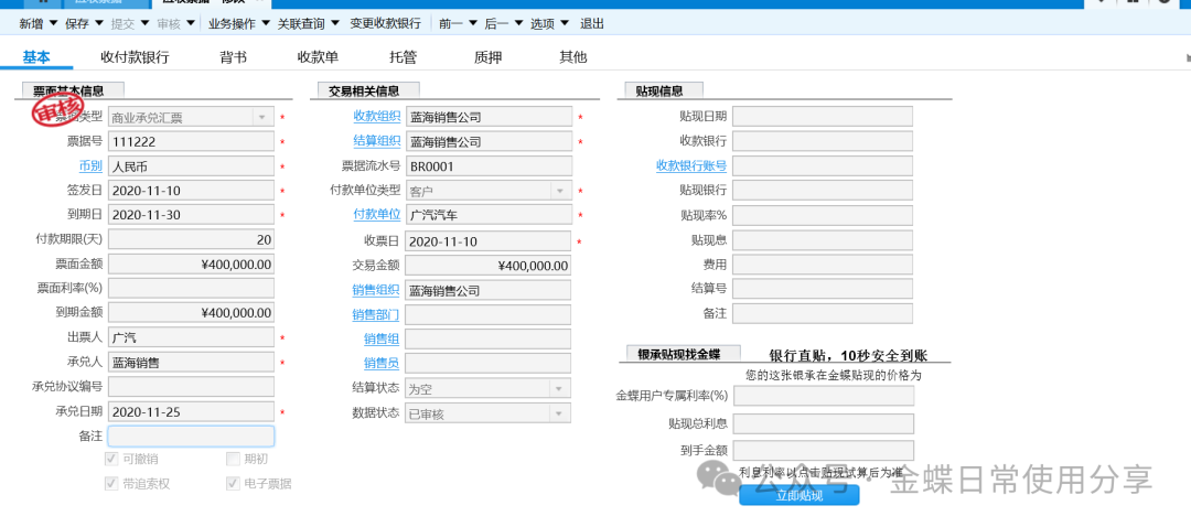 5、日常操作5.1日常存取现以及收付款业务处理:5.1.1现金存取单【业务场景】:处理日常存现、取现业务 【用户角色】:出纳 【功能菜单】:【财务会计】—>【出纳管理】—>【日常处理】—>【现金存取单】。 【操作说明】:企业用户按照业务需求新增现金存取单 5.1.2银行转账单【业务场景】:可处理日常企业内部转账业务,购汇业务也在此处理。 【用户角色】:出纳 【功能菜单】:【财务会计】—>【出纳管理】—>【日常处理】—>【银行转账单】。 【操作说明】:企业用户根据夜壶需求新增银行转账单 5.1.3收款/收款退款【业务场景】:处理所有对外收款业务。 【用户角色】:出纳 【功能菜单】:【财务会计】—>【出纳管理】—>【日常处理】—>【收款单】。 【操作说明】:企业用户根据业务需求新增收款单 【业务场景】:处理收款退款业务 【用户角色】:出纳 【功能菜单】:【财务会计】—>【出纳管理】—>【日常处理】—>【收款退款单】。 【操作说明】:企业用户根据业务需求新增收款退款单 5.1.4付款/付款退款【业务场景】:处理所有对外付款业务 【用户角色】:出纳 【功能菜单】:【财务会计】—>【出纳管理】—>【日常处理】—>【付款单】。 【操作说明】:企业用户根据业务需求新增付款单 【业务场景】:处理付款退款业务 【用户角色】:出纳 【功能菜单】:【财务会计】—>【出纳管理】—>【日常处理】—>【付款退款单】。 【操作说明】:企业用户根据业务需求新增付款退款单 5.1.5应收/应付票据【业务场景】:维护接收的应收票据/应付票据,以及进行应收票据/应付票据的后续结算业务处理。 【用户角色】:出纳 【功能菜单】:【财务会计】—>【出纳管理】—>【日常处理】—>【应收票据】/【应付票据】, 【操作说明】: 企业用户根据真实业务情况对应收/应付票据进行维护接收并进行后续结算业务处理。 5.1.6付款申请单【业务场景】:处理所有付款申请业务 【用户角色】:出纳 【功能菜单】:【财务会计】—>【出纳管理】—>【日常处理】—>【付款申请单】。 【操作说明】:企业用户根据实际业务情况新增付款申请单 5.2应收票据业务处理流程5.2.1应收票据登记【业务场景】:企业用户收到应收票据后系统上操作。 【用户角色】:出纳 【功能菜单】:【财务会计】->【出纳管理】->-【日常处理】->【应收票据】 【操作说明】:新增应收票据根据真实业务情况维护票据内容