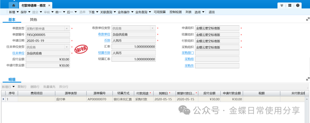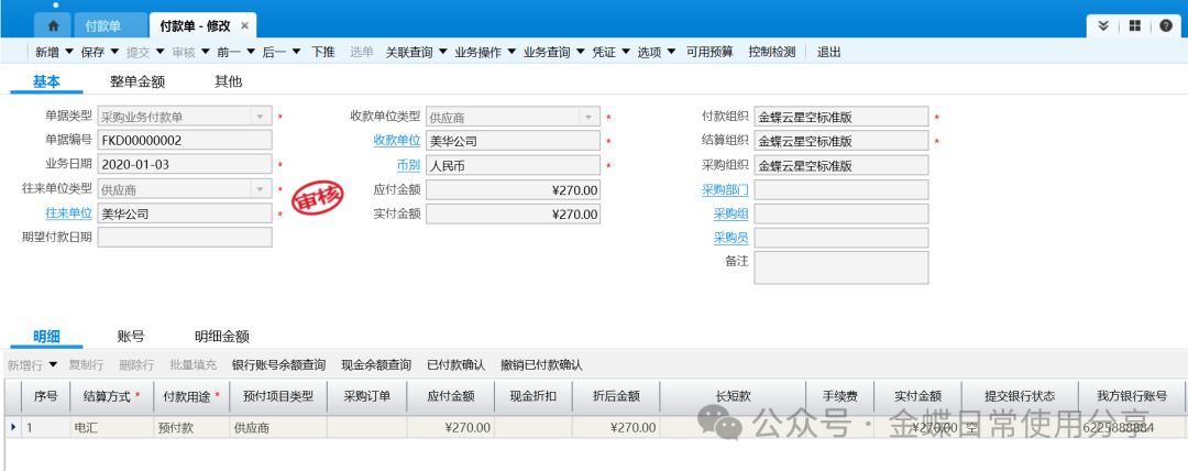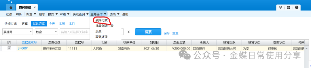 5.3.2应付票据到期付款【业务场景】:企业用户需要应付票据到期付款 【用户角色】:出纳 【功能菜单】:【财务会计】->【出纳管理】->-【日常处理】->【应付票据】->【业务操作】->【到期付款】 【操作说明】:具体操作如下