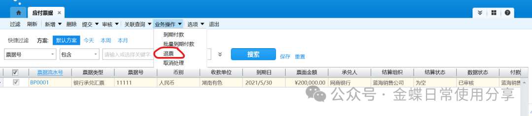 5.3.3应付票据退票【业务场景】:企业用户需要应付票据退票 【用户角色】:出纳 【功能菜单】:【财务会计】->【出纳管理】->-【日常处理】->【应付票据】->【业务操作】->【退票】 【操作说明】:具体操作如下