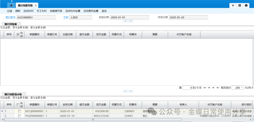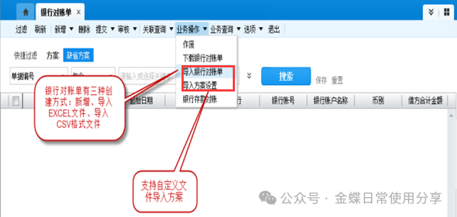 5.4现金盘点以及银行存款对账5.4.1现金盘点【业务场景】:出纳要定期进行现金盘点以确保账实相符 【用户角色】:出纳 【功能菜单】:进入【财务会计】—>【出纳管理】—>【现金盘点】—>【现金盘点表】,【操作说明】:进行库存现金的盘点。 5.4.2银行对账单【业务场景】:企业从银行取得对账单的纸质文件或电子文件,需要将数据录入本系统以备对账。 【用户角色】:出纳 【功能菜单】:【财务会计】—>【出纳管理】—>【银行对账】—>【银行对账单】 【操作说明】:可通过手工新增或者文件导入的方式维护银行对账单。 1、文件导入