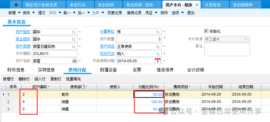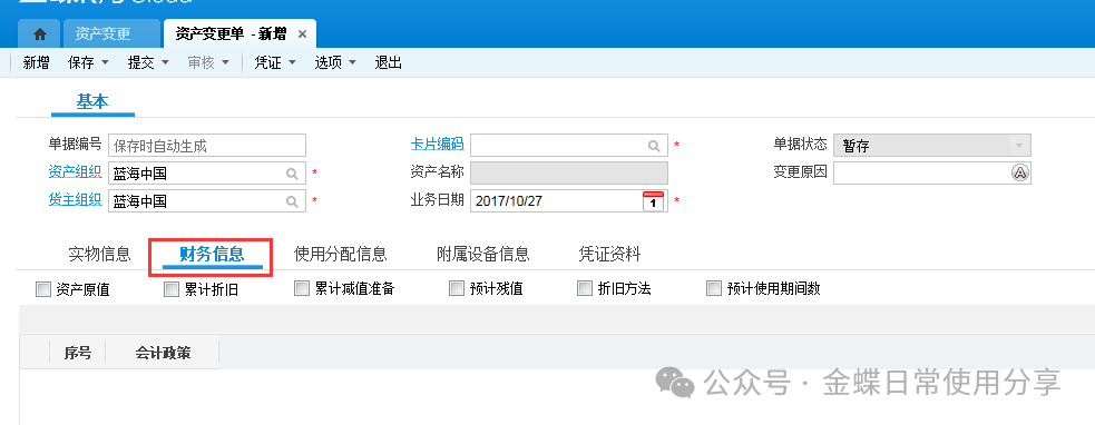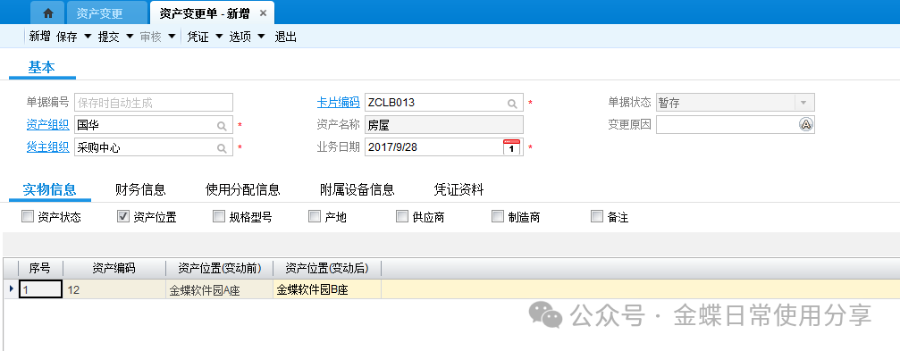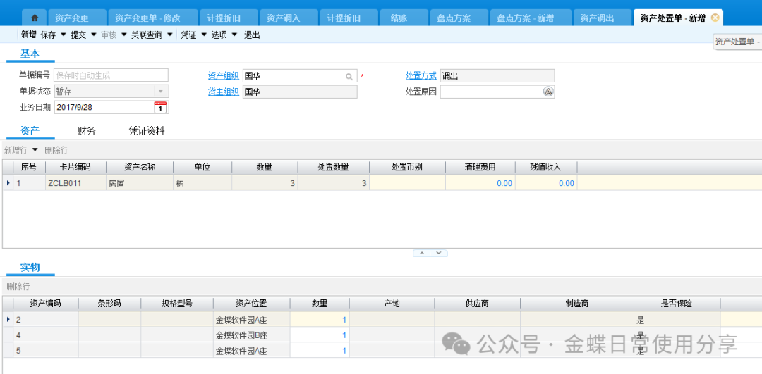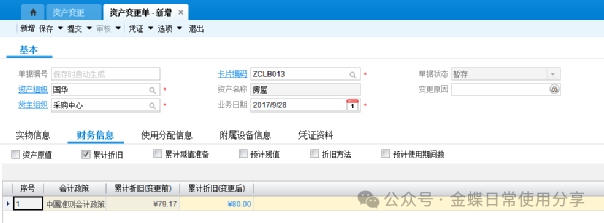 若资产卡片存在一卡多物(同一种物料多数量)的状况,则在实物信息页签中,可以通过资产编码区分不同的实物资产,一般一个资产编码一个实物资产,每个资产编码对应资产位置及数量。 注意:当一张卡片一卡多物的时候,在进行调入等日常管理时,该卡片上的所有东西都要进行该操作,变更频繁的固定资产,不宜一卡多物。 若资产卡片存在一物多分配的情况,则在使用分配页签中,针对资产编码设定分配比例。一个资产编码分配比例加一起应该为100%。 若还有附属设备、发票内容、维修保养需要记录,都可以放在附属设备、发票、维护保养页签中,此处仅作为管理需求存在,不影响财务计算。 3.2固定资产处置【业务场景】:企业用户对资产进行处置 【用户角色】:管理会计 【功能菜单】:【资产管理】->【固定资产】->【日常管理】->【资产处置单】 【操作说明】:当用户需要对固定资产进行出售等处置处理时,新增资产处置单,选择资产组织及货主组织,选择卡片编码,填入所需费用及得到的收入,确定实物分录,并进行提交、审核操作。 注:在做本月资产处置单之前不要做本月的计提折旧。 3.3固定资产变更【业务场景】:企业用户对存在信息变化的固定资产进行变更操作 【用户角色】:管理会计 【功能菜单】:【资产管理】->【固定资产】->【日常管理】->【资产变更单】 【操作说明】:新建资产变更单,首先选择资产组织及货主组织,选择卡片编码(只显示该资产组织及货主组织下的卡片编码,若没有需要的卡片编码,确定组织的正确性)根据实际情况填写变更数据,可变更的内容可详见各页签下信息,并提交审核。