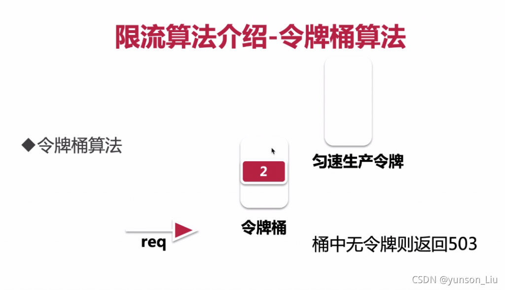 • 令牌以固定速率产生,并缓存到令牌桶中;