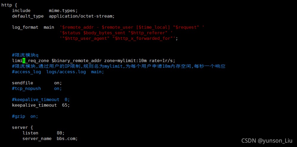 • 第一个参数:$binary_remote_addr 表示通过remote_addr这个标识来做限制,“binary_”的目的是缩写内存占用量,是限制同一客户端ip地址。