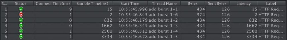 跟实例二相比,请求成功率没变化,但是总体耗时变短了。这怎么解释呢?实例二中,有4个请求被放到burst队列当中,工作进程每隔500ms(rate=2r/s)取一个请求进行处理,最后一个请求要排队2s才会被处理;实例三中,请求放入队列跟实例二是一样的,但不同的是,队列中的请求同时具有了被处理的资格,所以实例三中的5个请求可以说是同时开始被处理的,花费时间自然变短了。