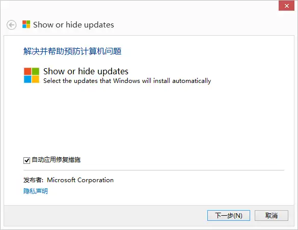 下载微软官网提供的「Show or hide updates」工具,临时隐藏受影响更新补丁推送安装。