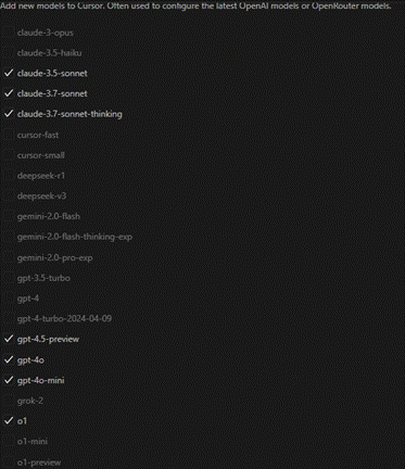 ③支持模型 Cursor爆火原因之一就是内置了许多功能强大的AI模型,诸如claude、GPT-4和Deepseek等,这里我们可以根据具体需要选取合适的模型。