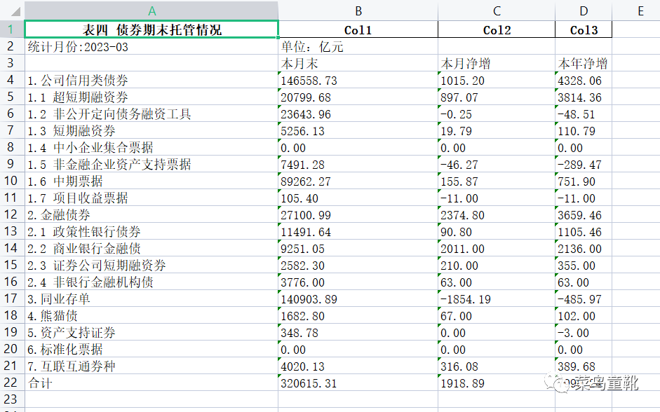 pip install pymupdf==1.23.0 pandas openpyxl首先我们从网址上海清算所_研究与统计 (shclearing.com.cn), https://www.shclearing.com.cn/sjtj/tjyb/ 下载债券期末托管的pdf,pdf中表格如下: