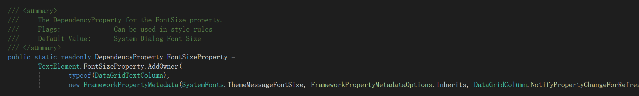 在WPF中一个很经典的可继承依赖属性的例子就是FontSize,让我们来看看它的定义: