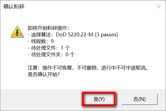 确认无误后点击开始粉碎,它会让你再次确认粉碎文件的数量,点击是即可彻底删除。