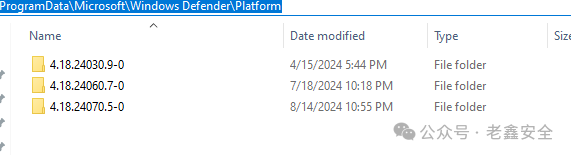 假如这是典型杀毒软件磁盘扫描功能中的一个代码片段——它获取文件路径,使用恶意软件特征库检测该文件数据,若发现有问题则删除该文件。 恶意程序可以创建一个文件,填入特定杀毒引擎能检测到的字节(例如,写入 EICAR 字符串),通过某种方式触发杀毒扫描(比如尝试读取该文件以触发实时防护扫描),随后迅速将该文件替换为指向其他文件的符号链接。 这就形成了众所周知的条件竞争:is_infected_file()处理的是一个文件,但remove_file()可能会处理另一个文件!路径虽然相同,但在这两个函数中指向了不同文件:一个是检测到有问题的常规文件,另一个是指向他处的符号链接。 So,remove_file()将删除符号链接指向的目标(该目标可由攻击者指定)。如果这个目标是杀毒软件自身的EXE,那么就会发生以下这种搞笑事情 比如有一个以NT AUTHORITY\SYSTEM身份运行的杀毒服务。黑客在设备磁盘上放置恶意的EICAR测试文件,随后开始循环检查文件的最后访问时间戳”,试图检测其文件是否被访问。当杀毒软件访问该文件并识别出恶意内容后,尝试将其从磁盘删除。然而就在此时,黑客将其文件替换为符号链接——该链接通过结合NTFS挂载点与对象管理器符号链接,最终指向杀毒软件自身的核心文件。如此一来,杀毒软件便完成了自我删除的窒息操作 见上图,存在任意文件删除漏洞的安全产品可不少呢,虽然很多都已经修复勒无法复现。但别担心,兄弟,软柿子始终都是有的,经过测试还有很多存在这种漏洞,为了避免风险,这里以Windows Defender为例...... 实战案例:Windows Defender的符号链接攻击每当有新版本更新时,WinDefend服务都会创建一个以新下载的版本命名的新文件夹,并将其放置在“ C:\ProgramData\Microsoft\Windows Defender\Platform ”文件夹中。新文件夹包含新版WinDefender的所有可执行文件。 当 Windows Defender 从旧版本过渡到新版本时会发生什么 ?