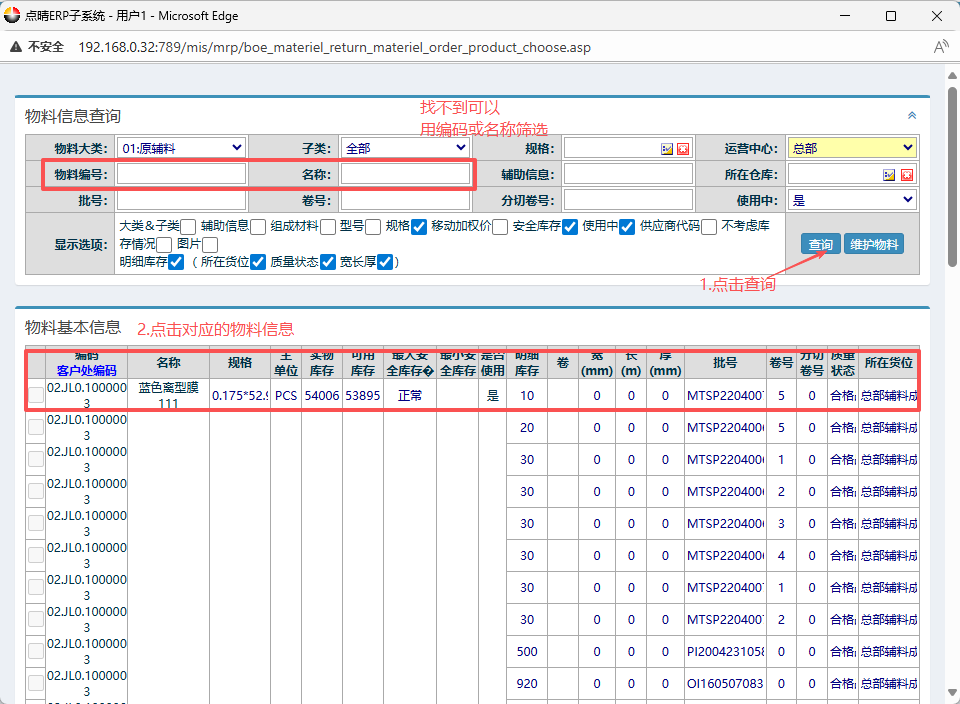 在弹出的物料信息窗口里,找到对应的原材料信息,然后点击查询(找不到可以用编码或名称筛选),点击对应的物料信息。