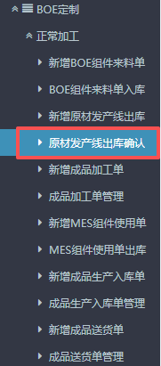 1.进入ERP系统之后,在左侧功能菜单里找到“BOE定制”,点击“正常加工”,找到“新增原材发产线出库”