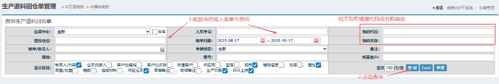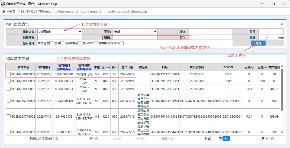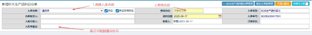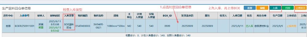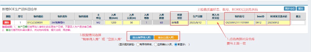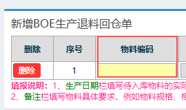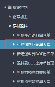 ![]() 1.进入ERP系统之后,在左侧的功能菜单里找到“BOE定制”,点开“原材退料”,点击“新增生产退料回仓单”。 2.进入界面之后,按图操作:点击选择入库仓库,然后查找仓位。备注可根据情况补充。 3.接下来点击下方的“物料编码”,会弹出对应的物料信息窗口。 按图操作,在弹出的信息窗口中点击选择物料大类,点击查询,然后点击对应的物料信息。 如果找不到可以用编码或名称筛选。 4.选好物料之后,按图操作:点击选择对应入库货位(要与上面一致),检查物料的质量状态、BOXID以及流水码。 然后根据情况选择提交“制单待入库”或“立即入库”。 5.提交后,回到左侧的功能菜单找到“生产退料回仓单入库”。 6.进入界面后,按图操作:根据入库单号或者仓位查询,如果都找不到可以用代码或者名称筛选,然后点击查询。 7.接着来到下方界面,按图操作:点击对应的回仓单信息,先进行入库操作,然后再上传BOE。 流程结束。 下一步教程跳转链接: 点晴ERP-退料到BOE出库单流程
