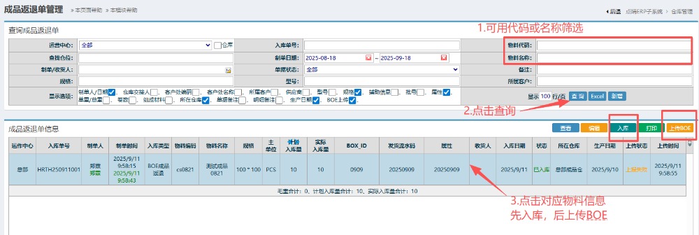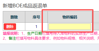 2.进入界面后,按图操作:点击选择入库仓库。备注可根据情况补充。 3.接下来在下方点开“物料编码”,会弹出物料信息界面。 在弹出的窗口内,按图操作:点击选择物料大类,点击查询。然后再点击对应的物料信息 注:如果找不到可以填写“编码”或“名称”进行筛选 4. 选好物料后,按图操作:填写入库数量,选择入库仓库(要与上面一致),填写BOXID和流水码。根据情况选择提交“待入库”或“立即入库”。 注:BOXID和流水码在“新增BOE组件来料单”的流程中已经填过的了,可以在“BOE组件来料单入库”里查看 5.提交完成后,回到左侧功能菜单找到“BOE成品返退单入库”。 6.进入界面后,按图操作:可用“代码”或“名称”筛选,点击查询。然后点击对应物料信息,先进行入库,再上传BOE。 流程结束。 下一步流程跳转教程链接: 点晴ERP-BOE返退品生产工单流程 点晴模切ERP更多信息:http://moqie.clicksun.cn,联系电话:4001861886 该文章在 2025/10/20 10:33:44 编辑过 |