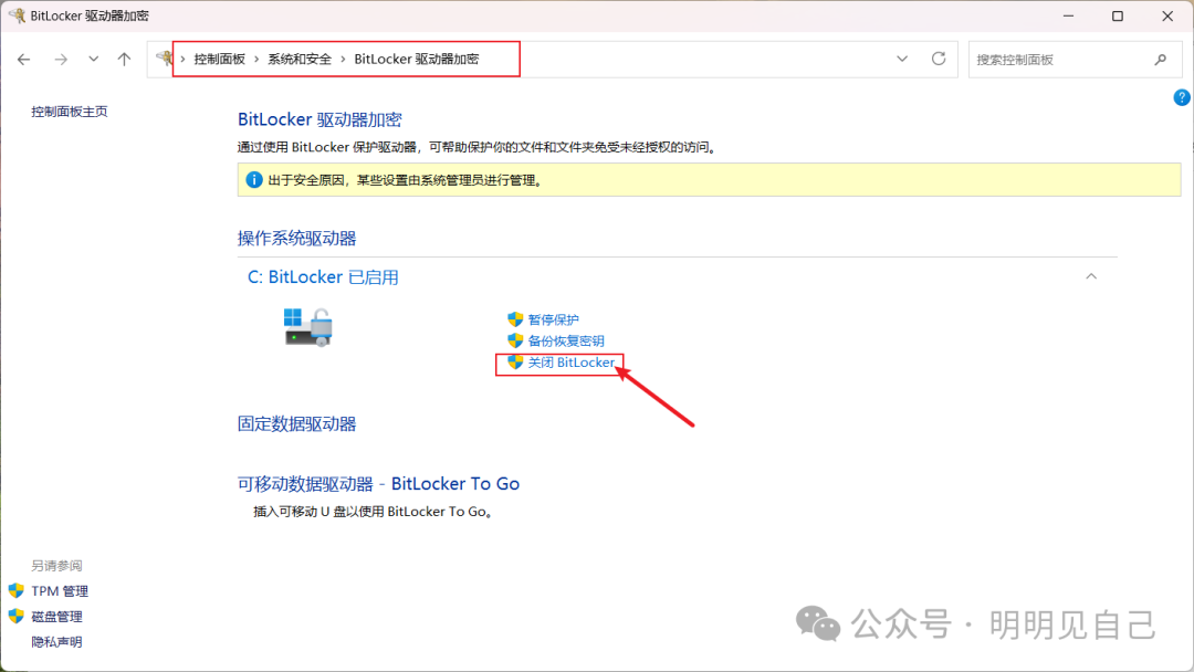 依次点「系统和安全→BitLocker 驱动器加密」,点击 C 盘右侧的「关闭 BitLocker」,系统会开始解密(根据 C 盘容量,可能要 10-30 分钟,别中途断电),解密完成后,C 盘的锁就消失了