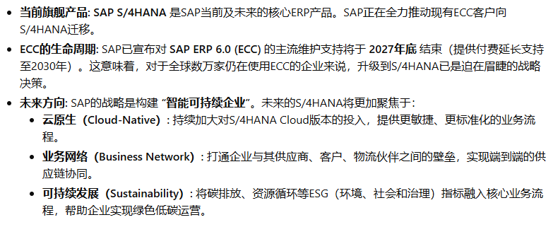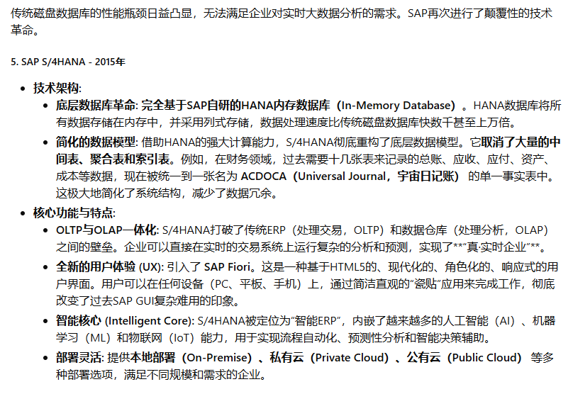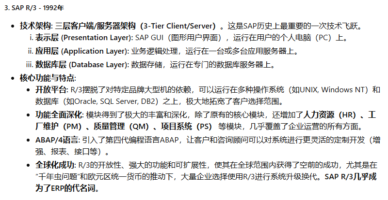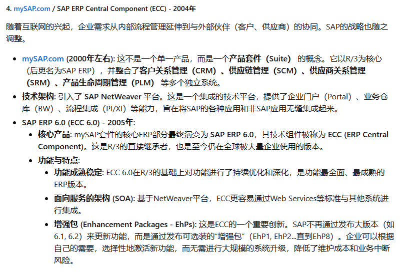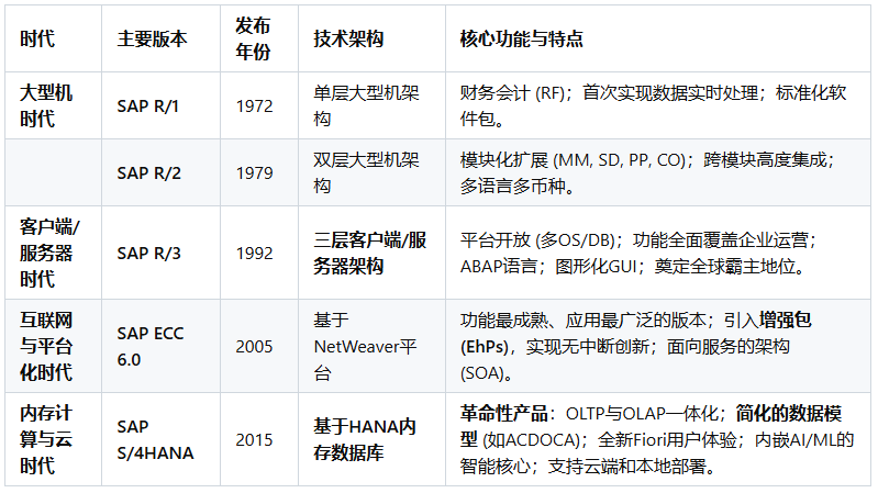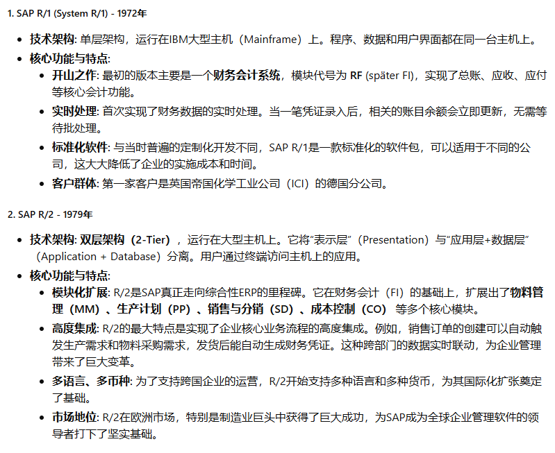 SAP(Systeme, Anwendungen und Produkte in der Datenverarbeitung,即“数据处理中的系统、应用和产品”)公司于1972年在德国魏恩海姆(Weinheim)成立。其创始人是五位前IBM公司的工程师:Dietmar Hopp, Hans-Werner Hector, Hasso Plattner, Klaus Tschira, 和 Claus Wellenreuther。他们的核心理念在当时是革命性的:开发能够实时处理业务数据的标准化商业软件。在那个年代,数据处理通常是批处理模式(Batch Processing),即数据被收集起来,在夜间或非高峰时段统一处理,管理者第二天才能看到报表。SAP的“实时(Real-time)”理念,旨在让企业在数据产生的那一刻就能进行处理和分析,为管理决策提供即时支持。这个初心贯穿了SAP产品演进的始终。SAP的ERP产品历程,是全球企业信息化发展的缩影,大致可以分为以下几个关键时代: 第一阶段:大型机时代 - 奠定基础 (1970s - 1980s) 第二阶段:客户端/服务器时代 - 称霸全球 (1990s) 第三阶段:互联网与平台化时代 - 延伸与整合 (2000s - 2010s) 第四阶段:内存计算与云时代 - 智能与简化 (2015年 - 至今)希望这份详尽的解读能够帮助您全面了解SAP ERP产品波澜壮阔的发展历程。