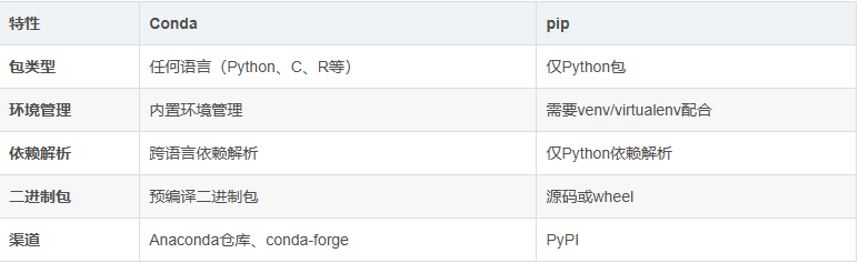 Conda和pip都是Python包管理工具,但它们在设计理念、功能和使用场景上有显著区别。以下是详细的对比: